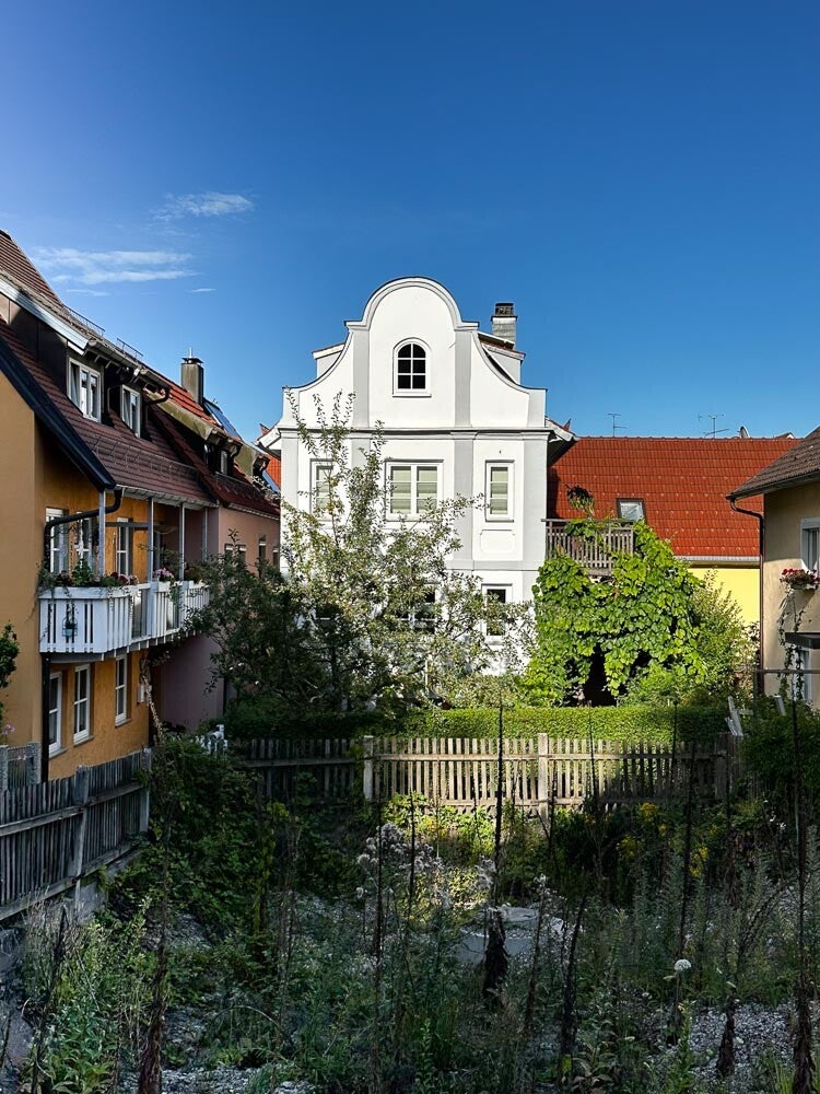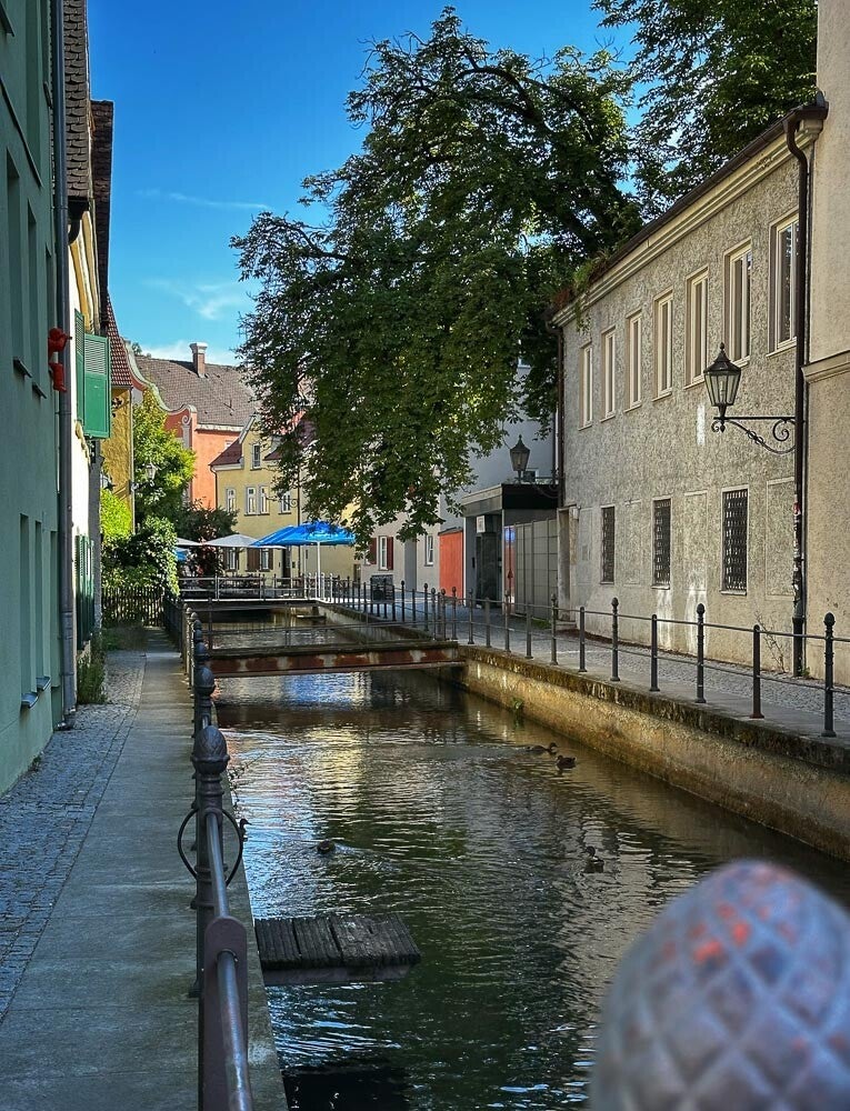 Der Wohnmobilstellplatz war zwar voll aber in der Nähe des Friedhofs gab es gute, kostenlose Parkmöglichkeiten. Kurz darauf waren wir dann auch schon in der Altstadt. Memmingen ist ein wirklich sehenswertes Städtchen mit schönen alten Häusern, viel Wasser und sogar nistenden Störchen. Nachdem wir uns eine Zeit mit Sightseeing beschäftigt haben suchten wir uns am frühen Abend ein Lokal direkt am Bach, wo es ein lecker Abendessen gab.