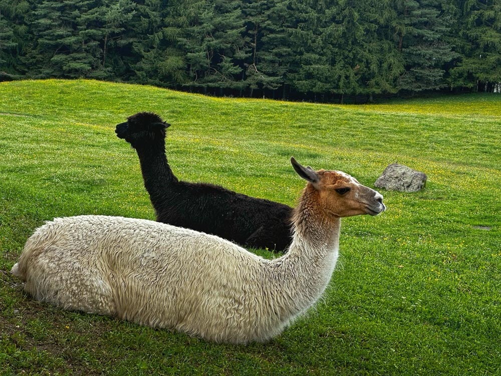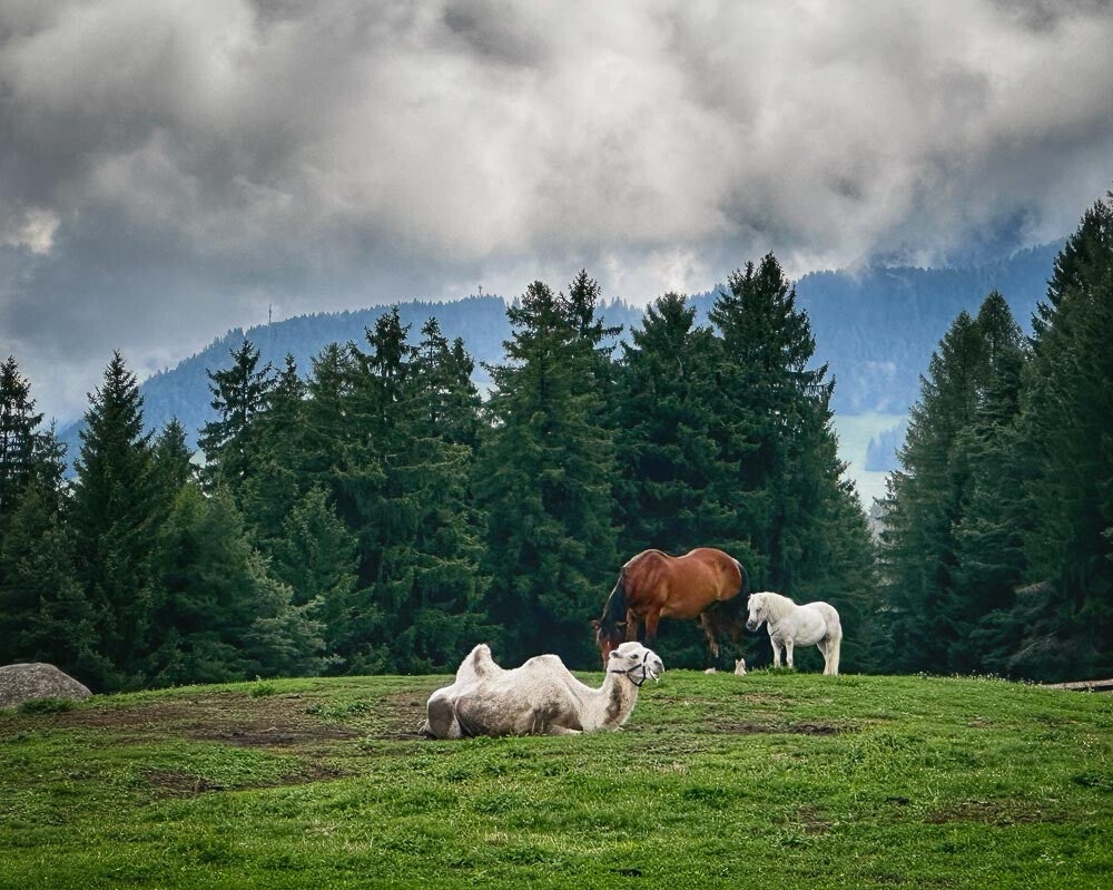 Die heutige Fahrradtour zur Tuff-Alm hatte phasenweise eine recht steile Wegführung. Ich dachte wenn ich hier stehenbleibe komme ich nicht mehr weiter und so bin ich den ganzen Weg nach oben gerast. Oben angekommen staunte ich nicht schlecht, das sich auf der, sehr schönen Alm, nicht nur Esel, Pferde und Alpakas tummelten, sondern auch Kamele auf der Wiese lagen. Nach einer kleinen Brotzeit ging es dann aber wieder bergab in den kleinen Ort Völs. Der hübsche Ortskern war leider ziemlich tot und als ein leichter Nieselregen einsetzte machten wir uns auf den Rückweg zum Womi. Besonders erfreulich waren die gut geführten Radwege die es hier vielerorts gibt.
